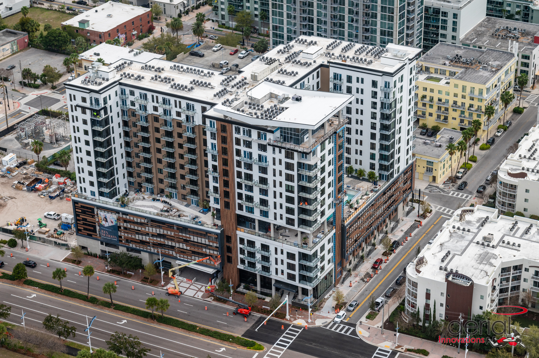 The 15-story, 330-unit building boasts water views and views of downtown Tampa. The street level is greeted by a 2-story lobby space at the corner of N. Meridian Avenue and East Whiting Street. This area is emphasized with double-height storefront and expansive amounts of glass. Two-story, townhouse style units create a street edge with their front stoop access. These also provide an eye-catching backdrop for the streetscape along East Whiting Street. These units turn the corner of the building at the south and east elevations to continue a pedestrian scale. The parking garage at levels 1 through 5 is cloaked from public view by carefully placed accent metal panels. These design elements help craft the pedestrian experience, by focusing on materiality and scale.